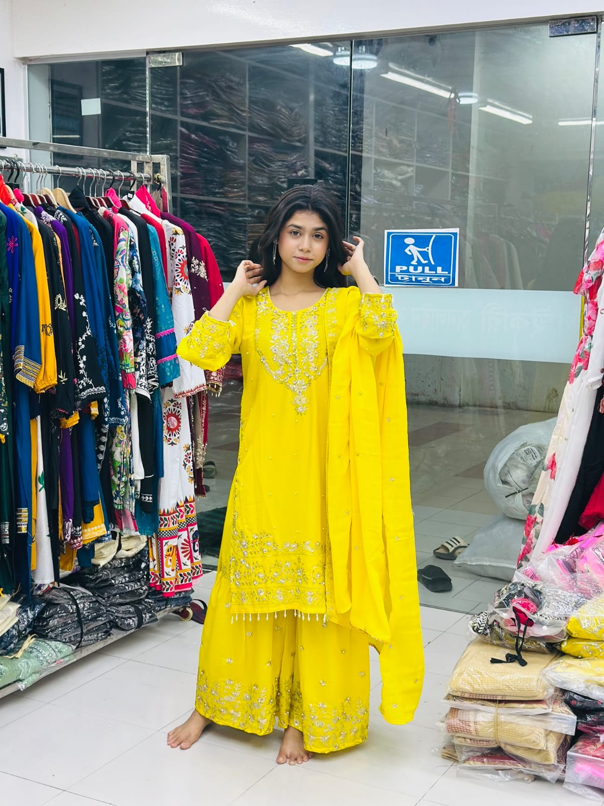 অনলাইনের ভাইরাল গারারা কালেকশন 😍 👉ফেবরিক্স - ইন্ডিয়ান লাক্সারি জর্জেট। 👉দুই পাশে কাজ থাকবে!! 👉 কালার দুই টা মেরুন/হলুদ!! 👉বডি সাইজ-৩৮,৪০,৪২,৪৪ পর্যন্ত। 👉 লং - ৪৩ ইঞ্চি। 👉ওরনা:ইন্ডিয়ান লাক্সারি জর্জেট। 👉ইনার: প্রিমিয়াম বাটার সিল্ক। 👉প্যান্ট : ইন্ডিয়ান লাক্সারি জর্জেট।