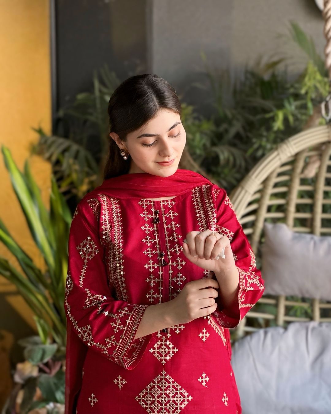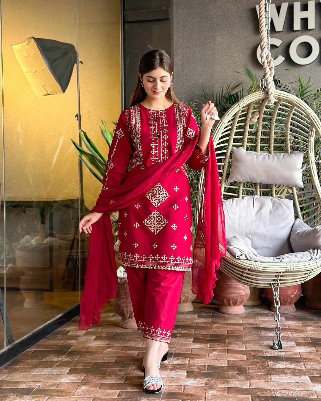 স্লাব কটন কাপড়ের উপর গর্জিয়াস হেভি এমব্রয়ডারি কাজ করা রেডি থ্রিপিস কালেকশন|